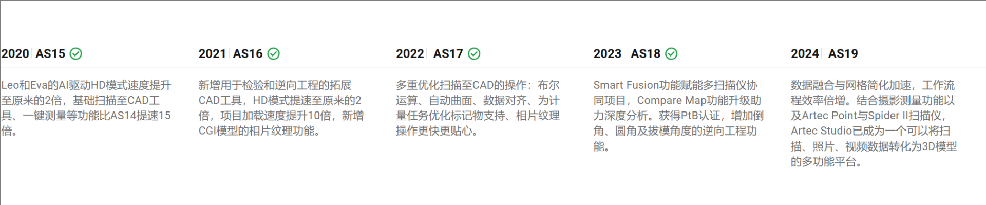 Artec Studio 19:基于3D扫描、照片、视频,打造数字孪生 一款功能强大且齐全的专业3D扫描与摄影测量软件,适用于3D建模、逆向工程、质检等多个领域 上传图像数据 搭建3D模型 优化模型 分析&导出 可使用来自任何设备的图像数据 在Artec Studio中使用Artec 3D扫描仪、照片和视频数据创建逼真的3D模型。 扫描仪 相机 智能手机 无人机 显微镜 一款软件,皆有可能 一体化解决方案,支持您工作流程的每个阶段。 用Artec 3D扫描仪捕获数据 将您的Artec 3D扫描仪与Artec Studio连接,开启扫描,实时反馈确保数据全面捕获。 了解更多 新功能:AI摄影测量 借助Artec Studio全新的物体与区域摄影测量算法,可将任何配备摄像头的设备所拍摄的照片和视频,转换为3D模型。 了解更多 编辑3D模型 使用手动与自动工具,精简3D模型并确保其水密性。 了解更多 逆向工程 借助Artec Studio中的逆向工程功能,全面提升设计与制造工作流程的效率。 了解更多 质量检验 Artec Studio工具齐全,能够进行快速且精确的测量,轻松实现网格到CAD的转换,以及网格间的偏差分析。 了解更多 数字化各式各样的物体 无论扫描对象体积如何,Artec Studio都能满足您的需求,助您搭建栩栩如生的3D模型。 极小型 小型 中型 大型 超大型 免费试用Artec Studio 19 Artec Studio 19功能齐全,您有机会免费体验这款业内领先3D数据捕获平台的新功能。 受到专家们的认可 每年更新 软件年年更新,用户的设备体验年年焕新。Artec Studio 19新增AI摄影测量功能,建模者都能看到模型效果的显著提升。 用户友好&技术支持 24小时全天候在线技术支持 Artec专家团队24小时全天候在线,助您充分挖掘Artec Studio的潜能。无论您是寻求故障排除的技巧,还是想搭建逼真的3D模型,我们的专家都很乐意为您提供帮助。 轻松导出数据 您可以将数据以网格、点云、测量数据或CAD图元的的形式,导出至任一款业内领先的逆向工程或3D建模软件。Artec Studio支持OBJ、STEP、STL等主流文件格式。如需更多信息,请访问参数规格页面。 16种语言支持 为确保全球个人及团队用户均可顺利访问,Artec Studio服务与功能目前共提供16种语言支持:简体中文、繁体中文、克罗地亚语、捷克语、英语、法语、德语、意大利语、日语、韩语、波兰语、葡萄牙语、俄语、西班牙语、土耳其语和乌克兰语。 Artec Studio 19参数规格 导入格式Artec 3D格式√CAD格式SAT, STEP, IGES, X_T导出格式网格OBJ, PLY, WRL, STL, AOP, ASC, USD, Disney PTEX, E57, XYZRGB, USDZ点云(仅适用于Artec Ray & Ray II)PTX, BTX, XYZ参照标记点OBC测量值CSV, DXF, XMLCADSTEP, IGES, X_T硬件支持兼容Artec Studio 19的3D扫描仪Artec Eva、Eva Lite、Leo、Metrology Kit、Micro II、Point、Ray II、Spider II,以及已停产的型号:Micro、Ray、Spider、Space Spider、Medit D700、MH 和 MHT 系列的AG、AC、W2和T2。 如需了解停产扫描仪兼容性的详细信息,请联系 support@artec3d.com。系统要求支持的操作系统Windows 10 x64、Windows 11推荐计算机配置第13或第14代Intel Core i7或i9处理器,RTX 4070显卡(8 GB)计算机最低要求第12代Intel Core i9处理器,RTX 4060显卡(8 GB)